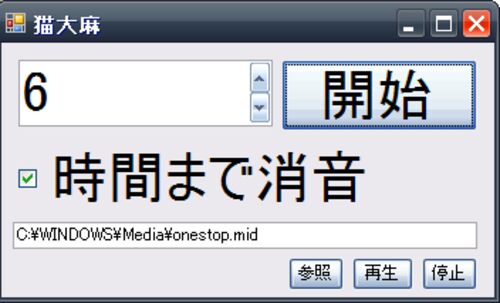 時間が来るまで、Windows の音量設定を 0 にしといてくれる機能がついただけの目覚ましプログラム。 事ある毎に音を鳴らすソフトを寝るときに落とすのは面倒なので書いた。 本当は、PCのプログラムじゃなくて "今から6時間後"みたいな設定のできるリアル目覚…